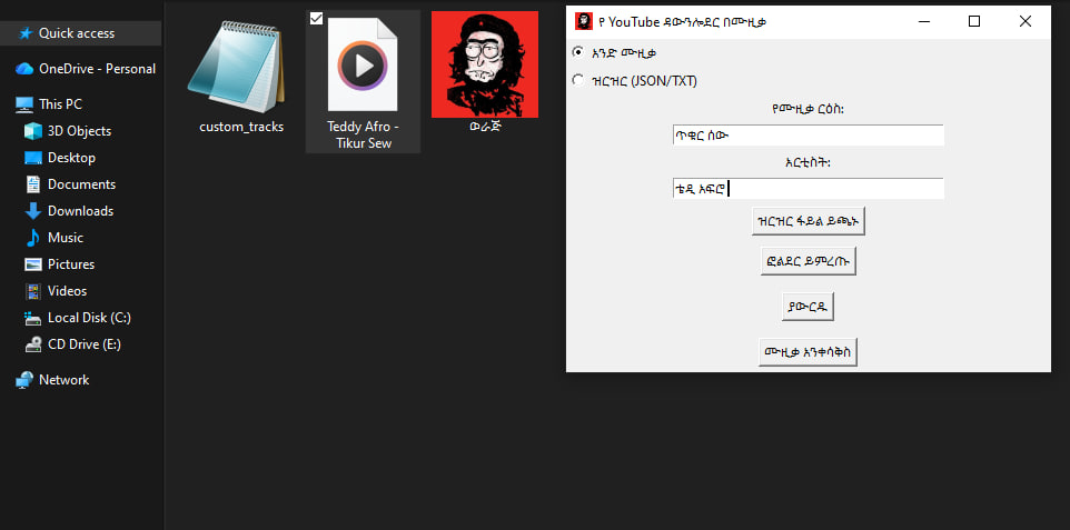 ይህ ቀላል መሳሪያ አፕሊኬሽኑ አንድ ዘፈን ወይም ሙሉ ዝርዝር (Playlist with JSON/TXT) ከ YouTube ላይ በቀጥታ ያውርዳል፣ እና በመውረድ ሂደት የሚያዝናና ሙዚቃ ይጫወታል።
